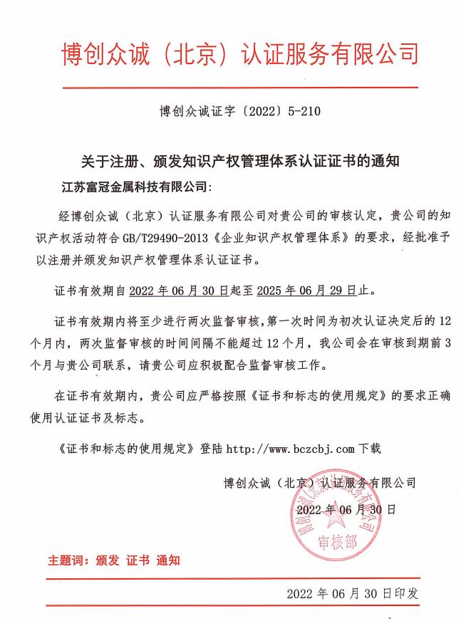 知識產(chǎn)權(quán)管理體系認證證書